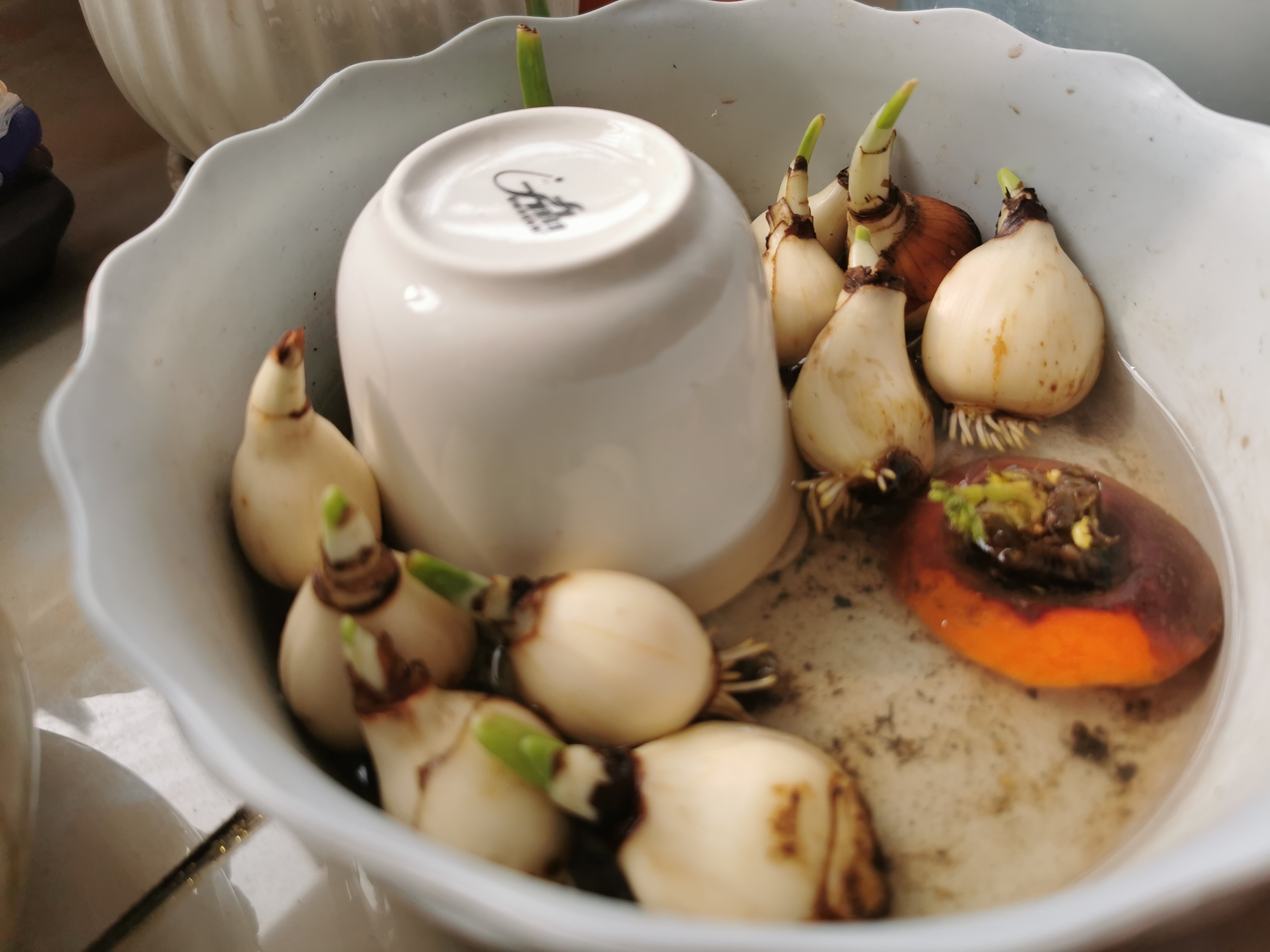 水仙花第5天,阳台水管花架种香菜第7天,已经有发芽的了。