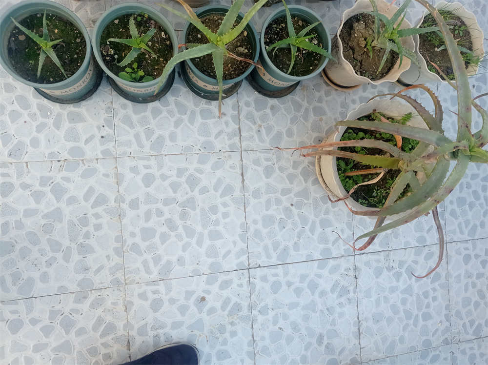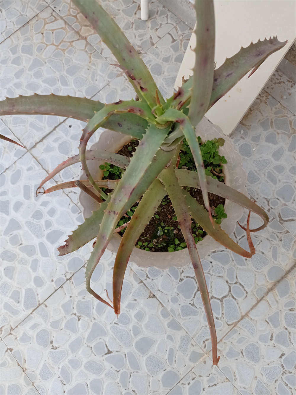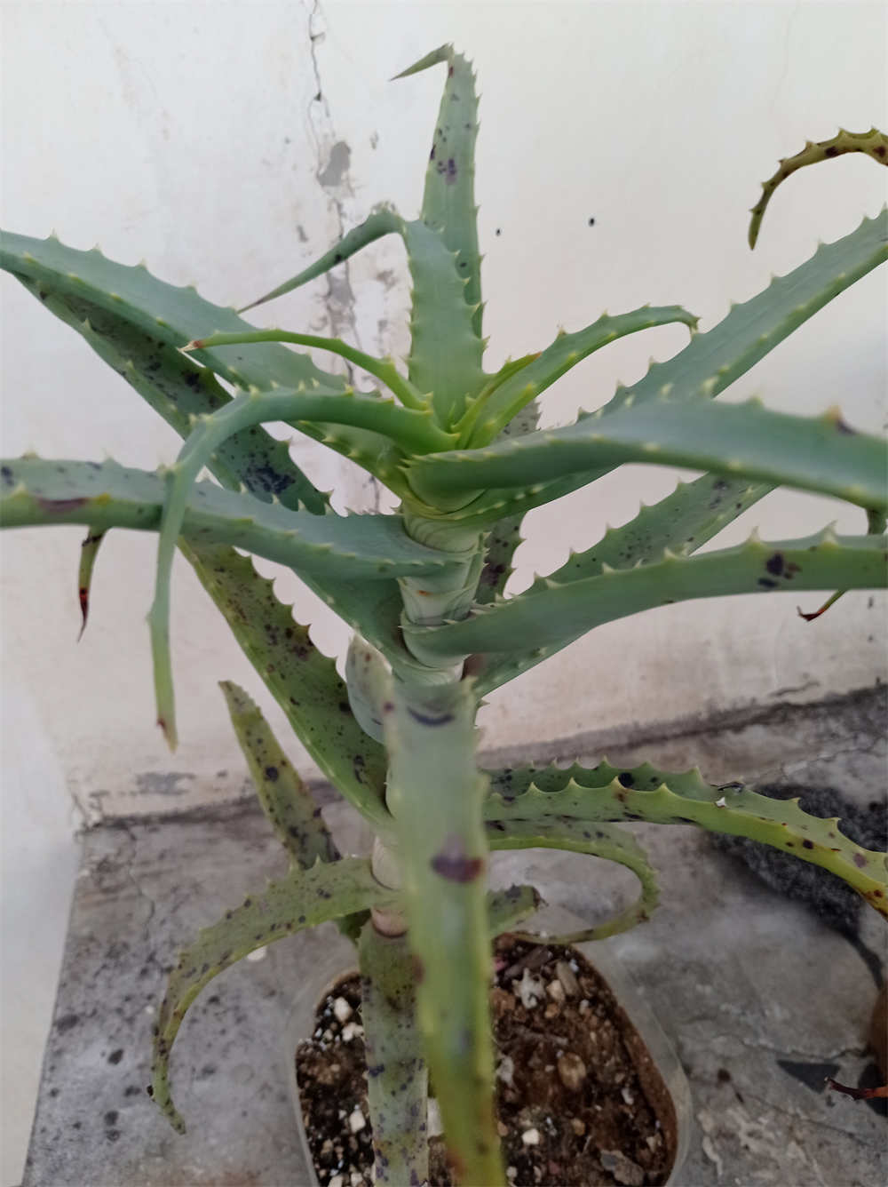 当年种的木立芦荟现在变成很多棵了,一直放在露台上养,最近发现芦荟叶片上好多黑点,长得也歪歪斜斜的,不知道该怎么办啦???