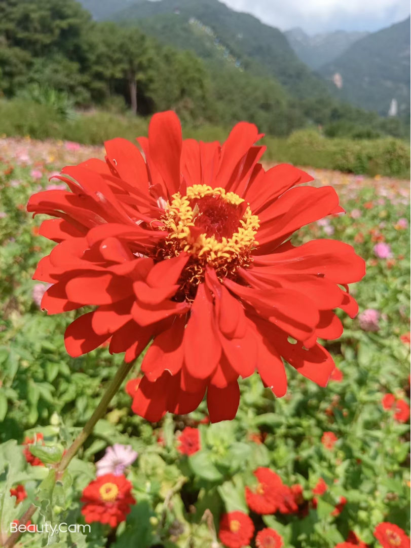 扎根于绿意盎然的花田间,粉紫色的花株点缀其间,绿叶繁茂,衬得红花更显娇艳。而更远处山野的清新与花海的明艳相融,一派生机盎然的景象。